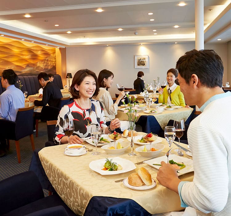 レストランではカフェテリアやセットメニュー形式にて北海道ならではの食材を利用した料理を取り揃えております。また、夏季は後部デッキでバーベキューガーデンをオープンしています。爽快な青空と日本海の大海原のもと、ご家族やグループでわいわいお楽しみください。