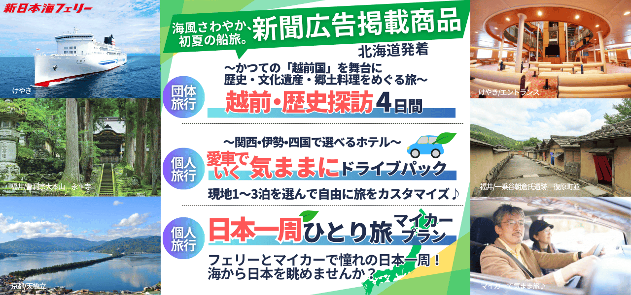 新日本海フェリーの乗船代に、愛車と一緒に本州を巡れる往復航送代をセット。