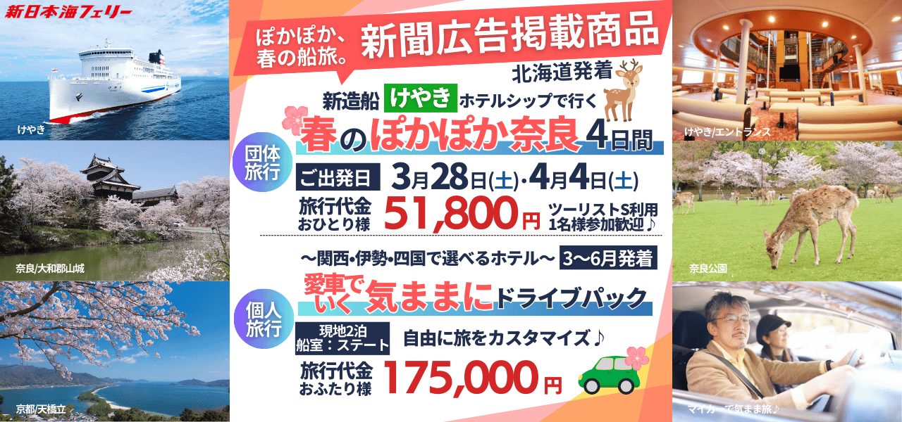 新日本海フェリーの乗船代に、愛車と一緒に本州を巡れる往復航送代をセット。