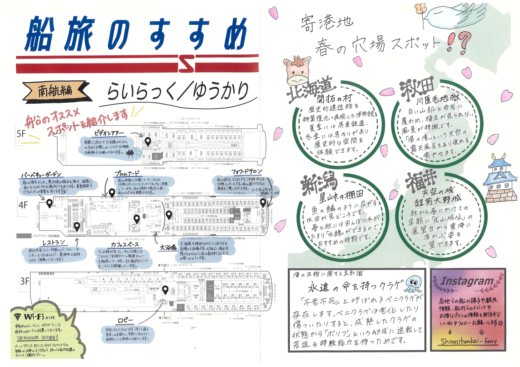船旅プランとおすすめ情報 2020/1/9 ホーム あなただけのひとときが見つかります 船旅を楽しむためのプランやモデルコースなど船旅に役立つおすすめ情報をご紹介します。 おすすめ情報 パッケージツアー モデルコース デジタルパンフレット おすすめ情報 おすすめ情報 新造船「はまなす」6月29日(月)就航! おすすめ情報 ”推し船社”へ投票!『第二回御船印総選挙』決勝進出します! 予選1位通過!引き続きの応援をお願いします! おすすめ情報 北海道発着『愛車でいく春のドライブパック』のご案内 2026.03.09 - 2026.06.30 北海道から本州各地へ豊富なプランをご用意しました♪ おすすめ情報 選べる4プラン北海道「美食」ドライブパック 2026.03.09 - 2026.05.31 お寿司・かにディナー・スイートルームでの部屋食と北海道の味覚から選べるプラン・・・ 一覧をみる パッケージツアー 個人プラン 3~6月 北海道発着!愛車でいく気ままにドライブパック 2026.03.01 - 2026.06.30 出発地:小樽港、苫小牧東港 到着地:舞鶴港、敦賀港、新潟港 【北海道発】本州旅行を自分好みにカスタマイズしてお楽しみいただけるプランです・・・ 団体プラン 【小樽発着団体ツアー】春のぽかぽか淡路島4日間 - 出発地:小樽港 到着地:舞鶴港 お土産付き!爽やかな季節「淡路島」を旅しませんか? 一覧をみる モデルコース 北海道 道南の函館・松前たっぷりドライブ 出発地:函館・松前 道南の観光名所をおさえた、たっぷり北海道を楽しめるドライブコースです 本州 北東北漫遊ドライブ 出発地:北東北 秋田港を起点に、北東北の文化・自然・温泉を堪能! 一覧をみる デジタルパンフレット 「夢人旅」~ゆめひとたび~ 夢と人、そして旅をつなぐ。船旅にゆたかさと彩りを添えるとびっきりの情報をお届けします。 船内案内紙 各船に設置の船旅案内誌です。寄港地のスタッフおすすめの情報を掲載しております!