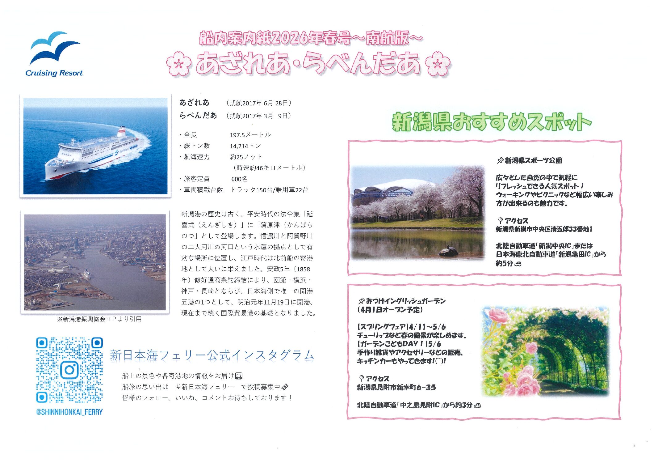 ホーム 船舶 けやき/あかしあ すずらん/すいせん らべんだあ/あざれあ らいらっく/ゆうかり 全ての船舶 ▲ ▼ 船旅案内紙 2020/2/20 新潟→小樽 かもめだより 小樽フェリーターミナルより小樽のおすすめスポットをご紹介します♪ 詳細へ 小樽→新潟かもめだより 新潟フェリーターミナルより新潟のおすすめスポットをご紹介します♪ 詳細へ