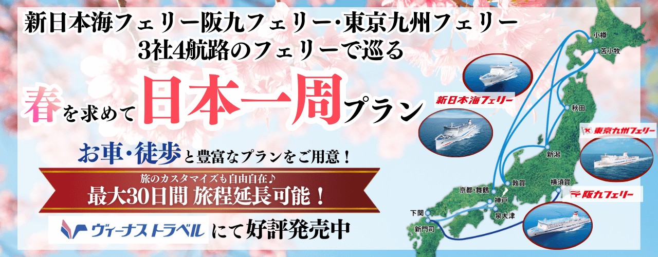 フェリー4航路に乗船し、おふたり様で17万円からと日本一周をリーズナブルに楽しめます♪