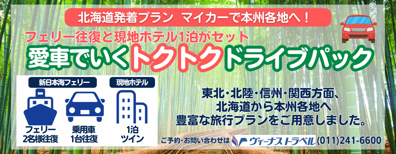 旅行会社ヴィーナストラベルでは本州各地へ、フェリー往復と現地ホテル1泊がセットになったオトクな旅行プランを発売開始♪