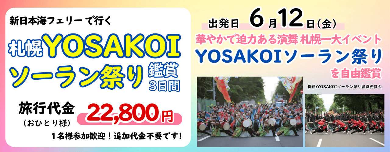 〇YOSAKOIソーラン祭り(自由観覧/自由昼食)14:30再集合=小樽港(16:45発)~新日本海フェリー/ツーリストA~【6/14】新潟港