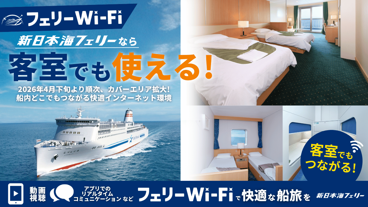 これまで「au Starlink フェリーWi-Fi」は、エントランスホールやレストランなど一部のパブリックスペースに限って提供しておりましたが、2026年4月下旬より順次、船内カバーエリアを拡大し、客室でもご利用可能となります。